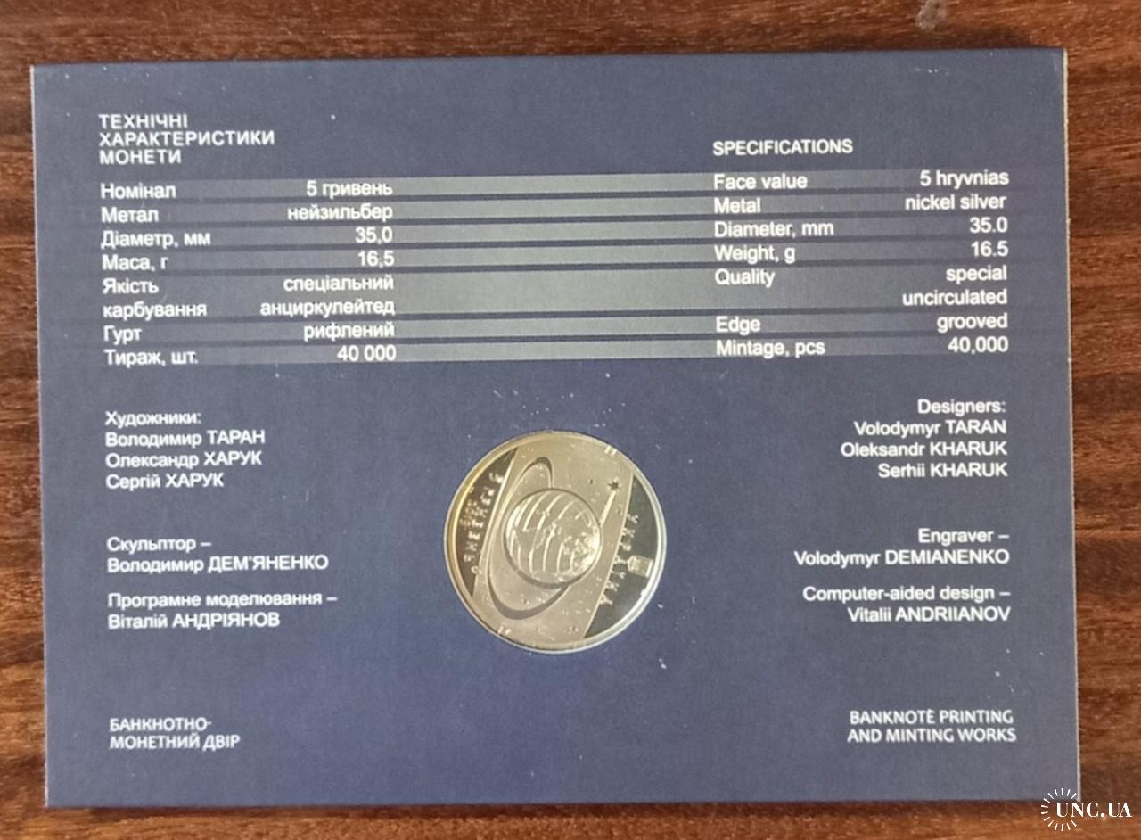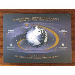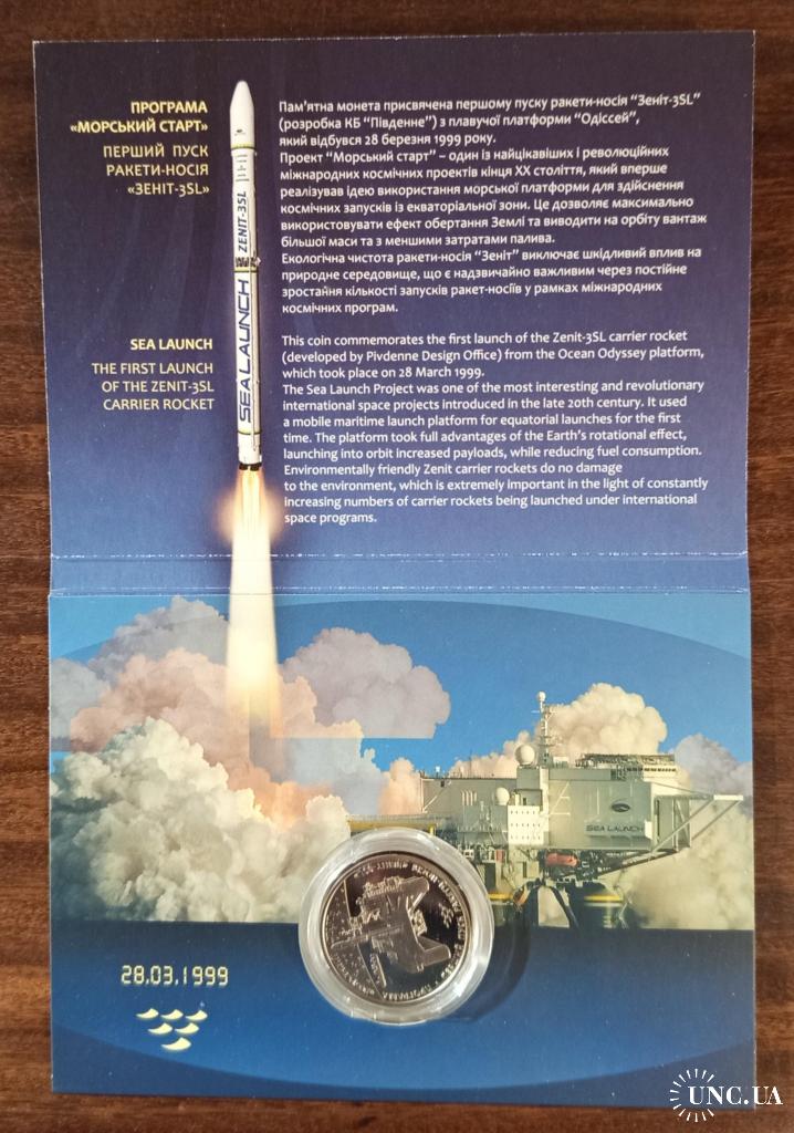 ОригіналУкраїна 5 гривень Первый пуск ракеты-носителя Зенит-3SL в сувенірній упаковці 2019.Банківський стан