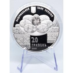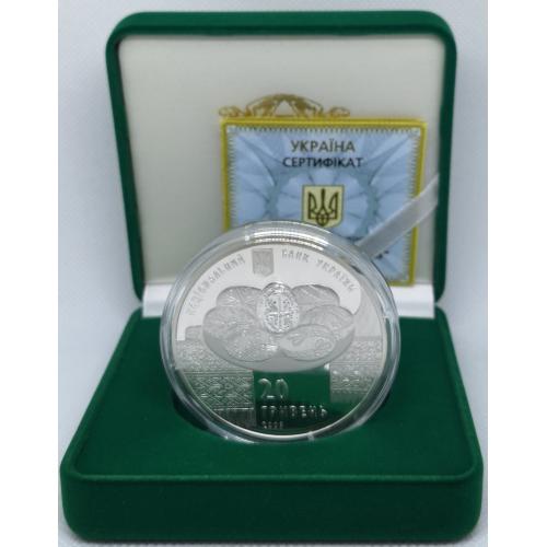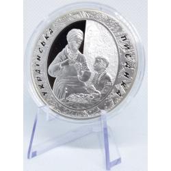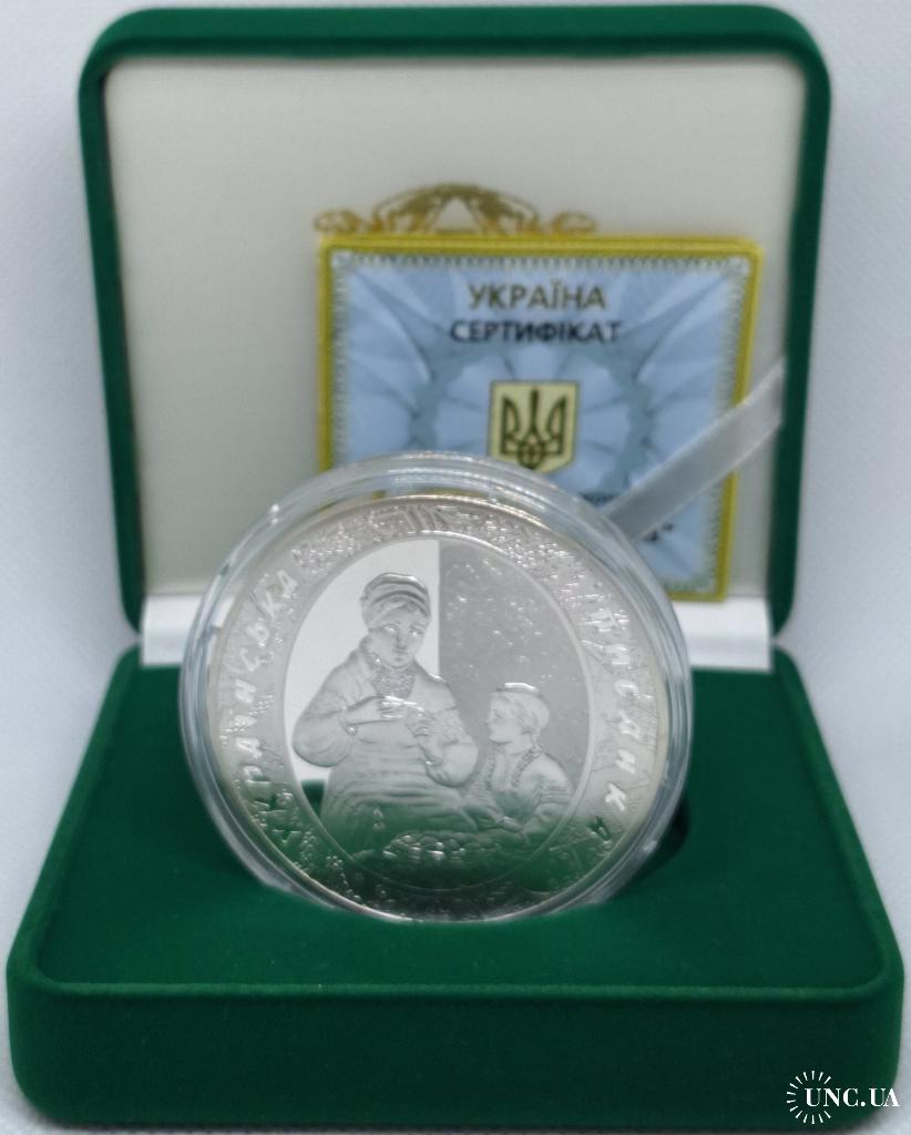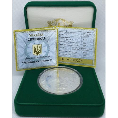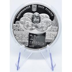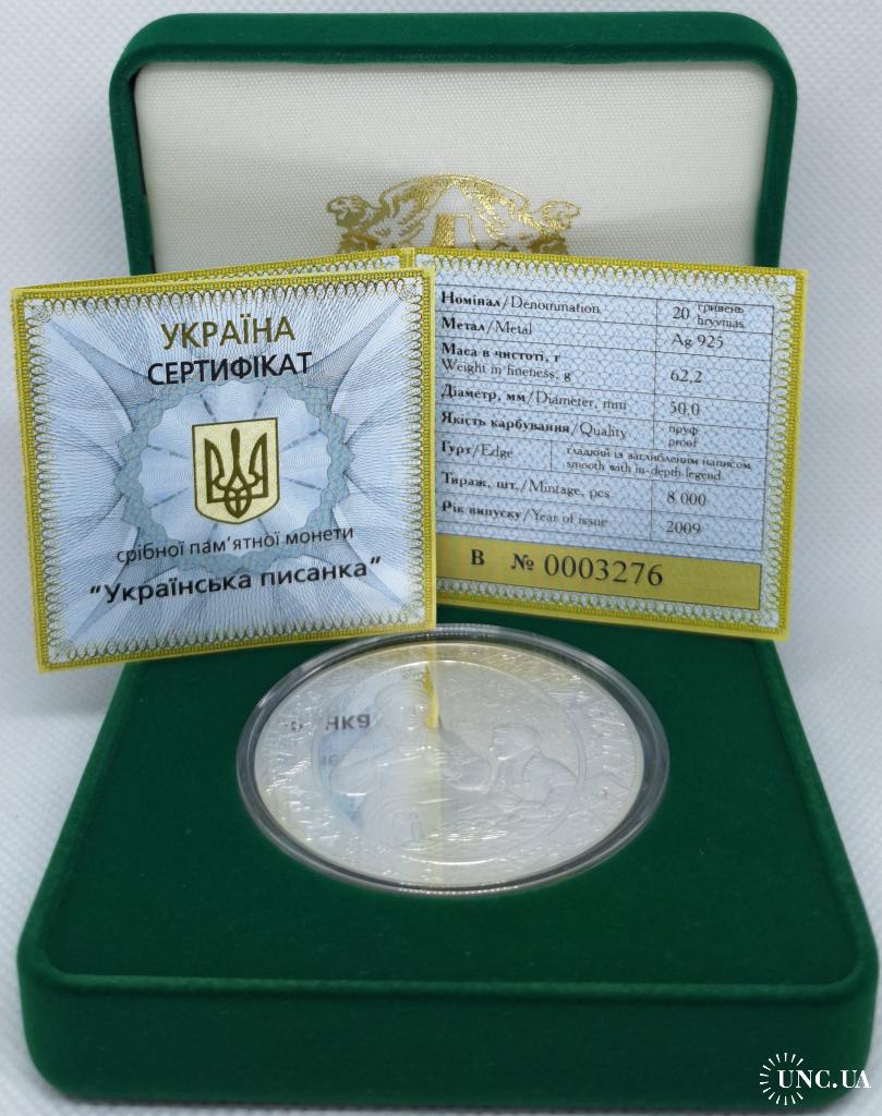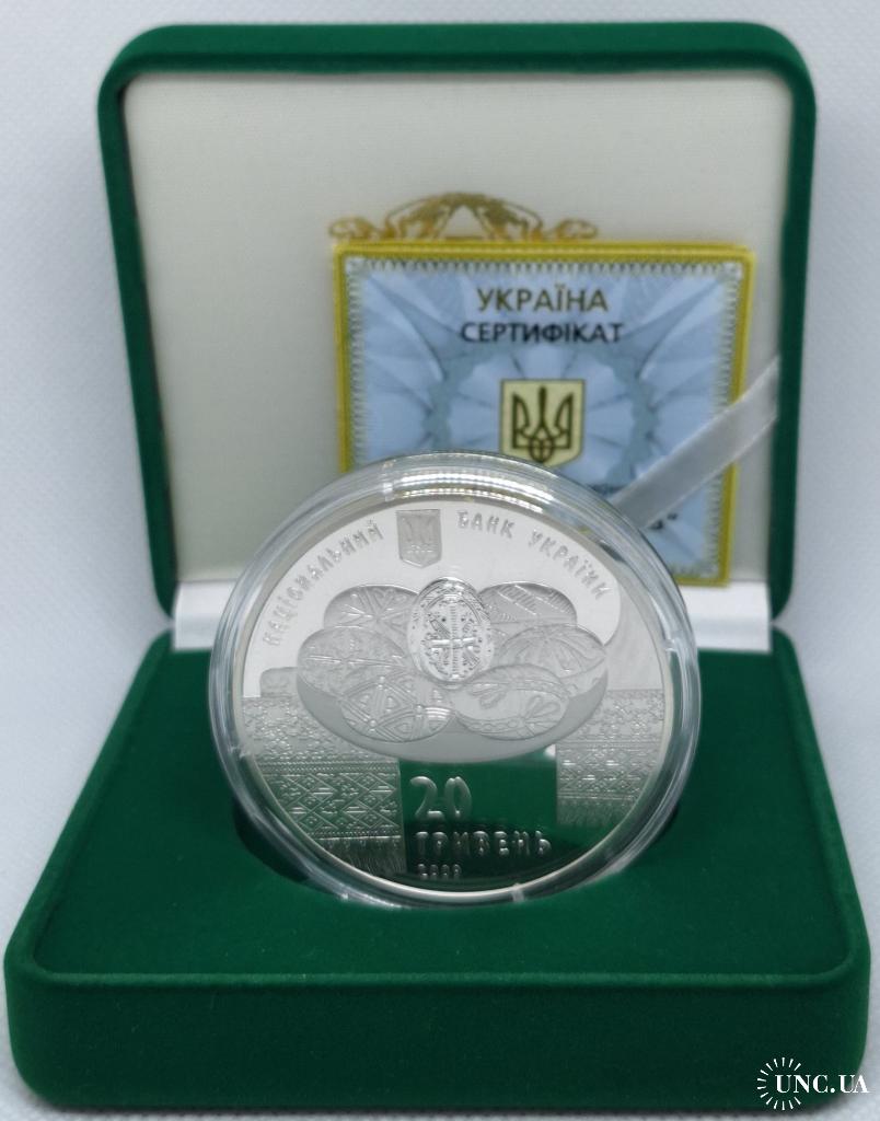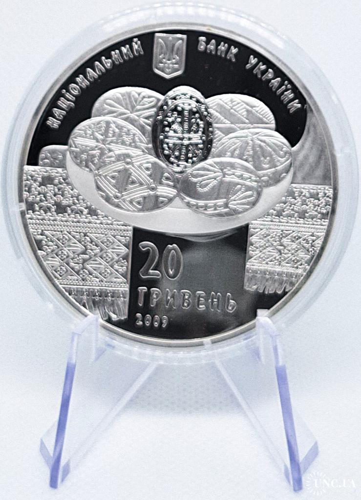 На аверсі монети розміщено: угорі - малий Державний Герб України, напис півколом НАЦІОНАЛЬНИЙ БАНК УКРАЇНИ, на тлі рушників зображено композицію - на тарілі писанки, оздоблені геометричним і рослинним орнаментами, притаманними різним областям України, під якою напис 20/ГРИВЕНЬ/ 2009.