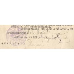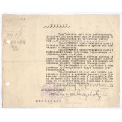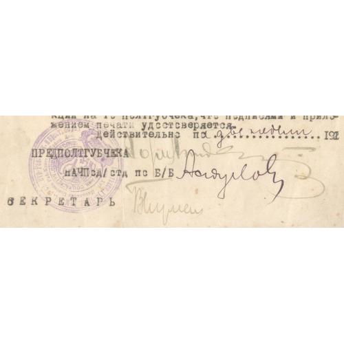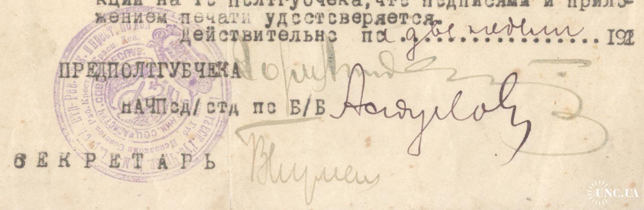 Мандат. Предъявитель сего есть действительно сотрудник для поручений при уполномоченном по борьбе с бандитизмом по Чутовскому району тов. Потапенко. Тов. Потапенко представляется право производства обысков, выемок, и ареста лиц причастных к бандитизму. Тов. Потапенко предоставляется право пользоваться всеми средствами передвижения и обывательскими подводами. Всем гражданским и военным властям Полтавская Губчека предлагает оказывать т. Потапенко всемерное содействие при исполнении возложенных на него служебных обязанностей. Лиц уклоняющихся от содействия и оказывающих противодействие будут преданы суду Ревтрибунала. Тов. Потапенко по роду его службы разрешается ношение и хранение разного рода оружия, как огнестрельного так и холодного, а также не может быть арестован и задержан без санкции на Полтгубчека, что подписями и приложением печати удостоверяется. Действителен на две недели.