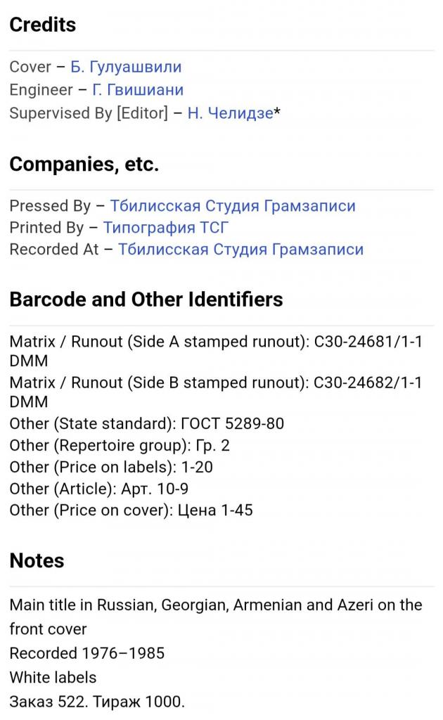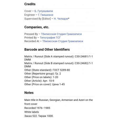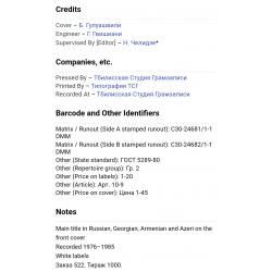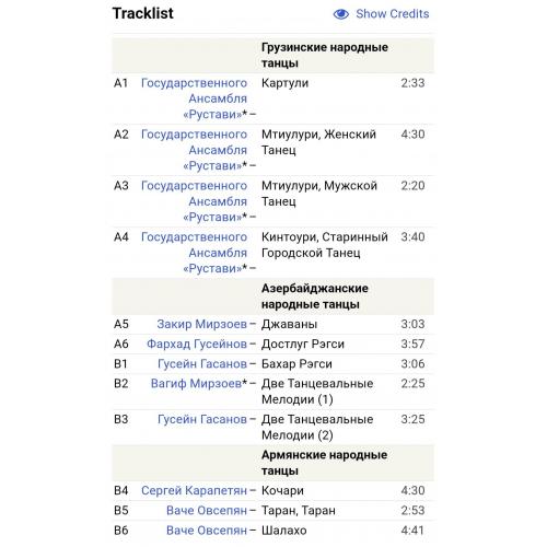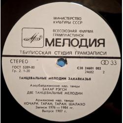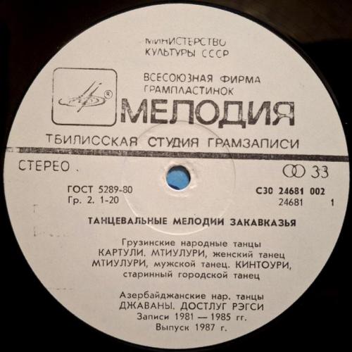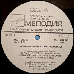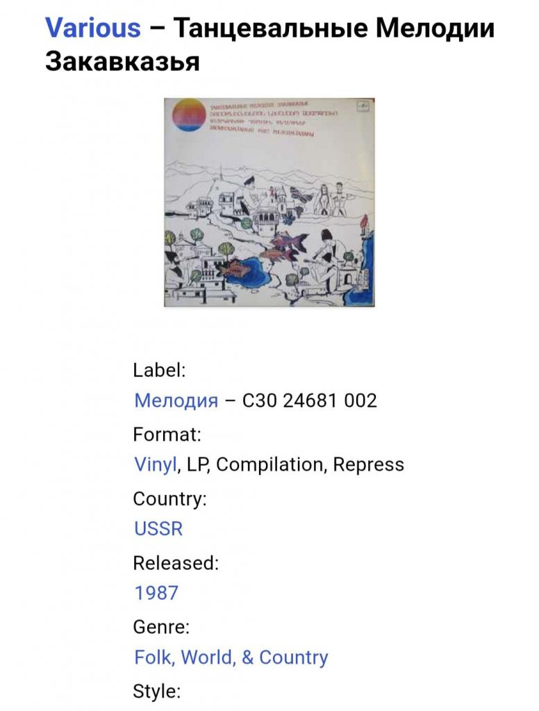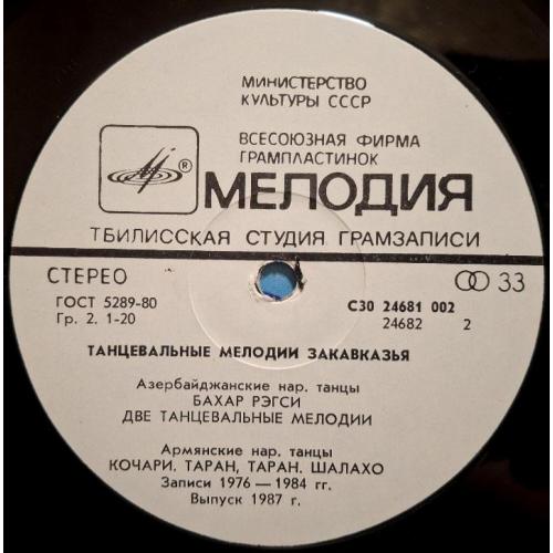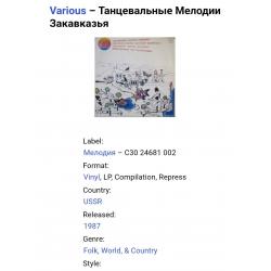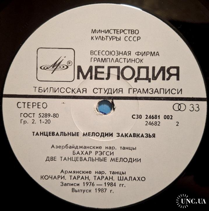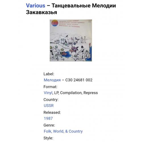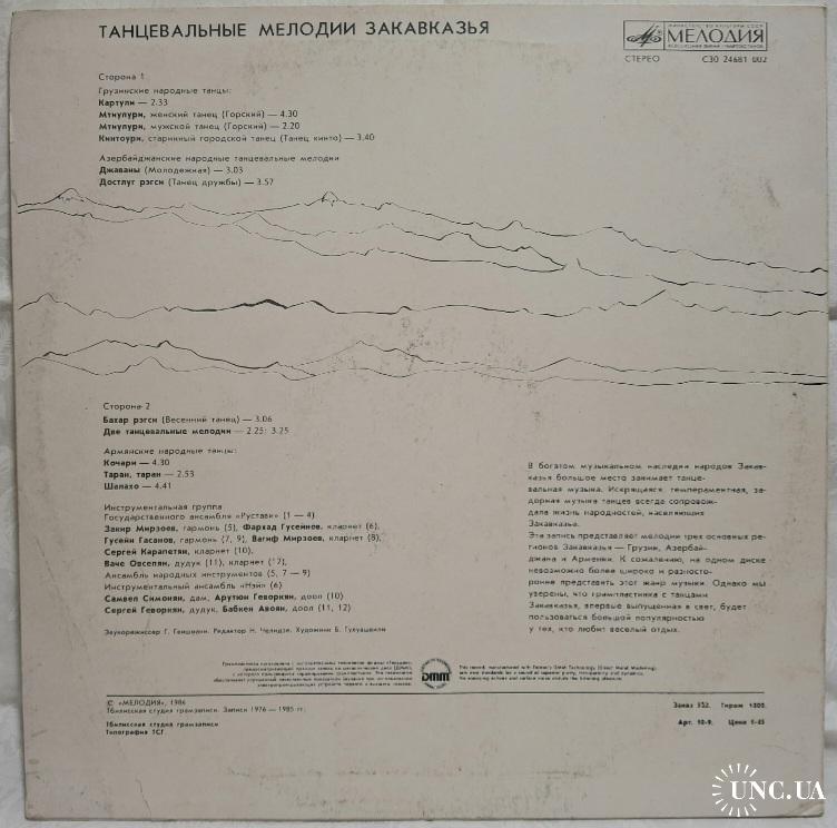 Вінілова платівка. Збірка традиційних, національних мелодій Закавказзя (Грузії, Арменії, Азербайджану) у виконанні ансамблю Руставі, ансамблю Ней, Закіра Мірзоєва, Фархада Гусейнова, Гусейна Гасанова, Вагіфа Мірзоєва, Сергія Карапетяна, Ваче Овсепяна, Самвела, Симоняна, Арутюна Говоркяна, Сергія Говоркяна та Бабкена Авояна (Танцевальные Мелодии Закавказья) 1976-85. Випуск фірми (Мелодія) СРСР, Тбіліською студією Грамзапис, 1987-ий рік. Оригінальне, Грузинське видання. Лімітований тираж (Limited Edition) 1000 копій. Рідкісне (Rare). Стан платівки: сторона А- ЕХ-. Сторона B- VG+ (на другій композиції є царапки що призводять до цокання і декілька незначних перескоків). Стан конверту ЕХ-/VG+. Відправка по Україні службами доставки: Нова Пошта, Укр Пошта, Делівері. Також відправляємо посилки за кордон по цілому світу.