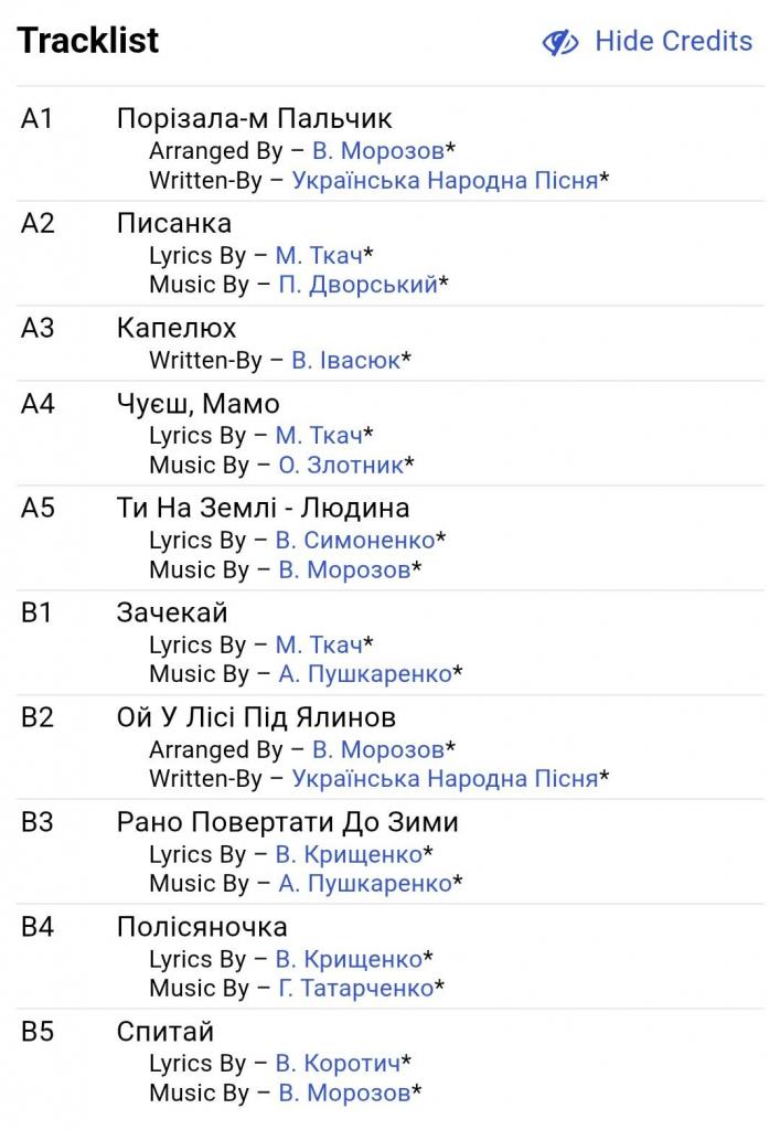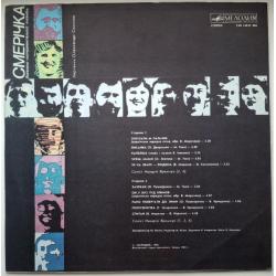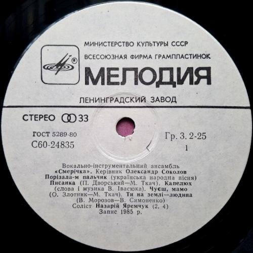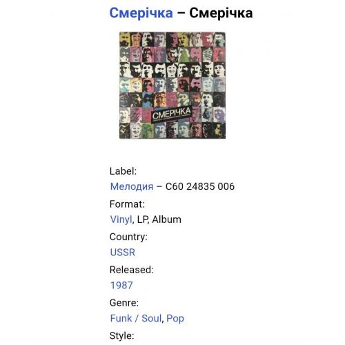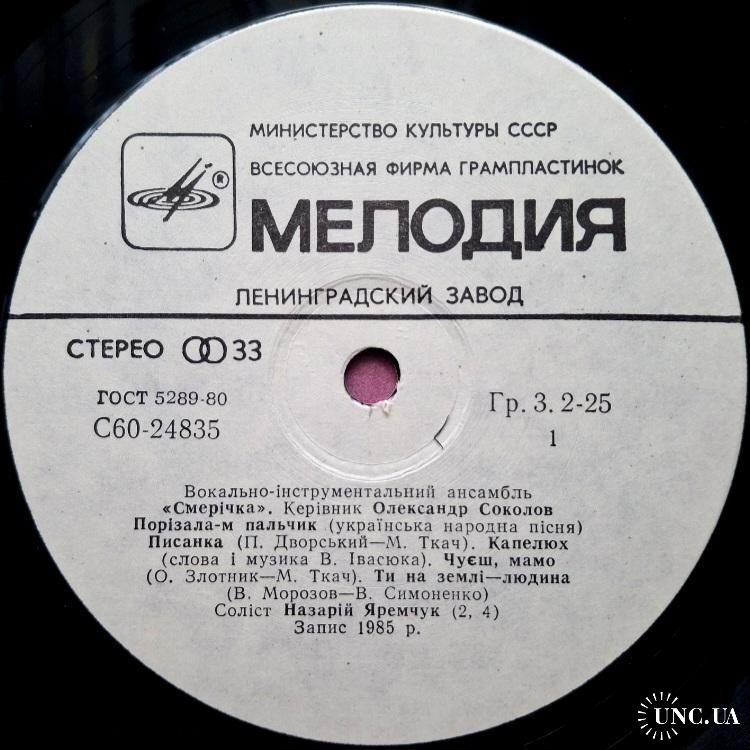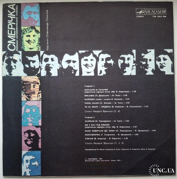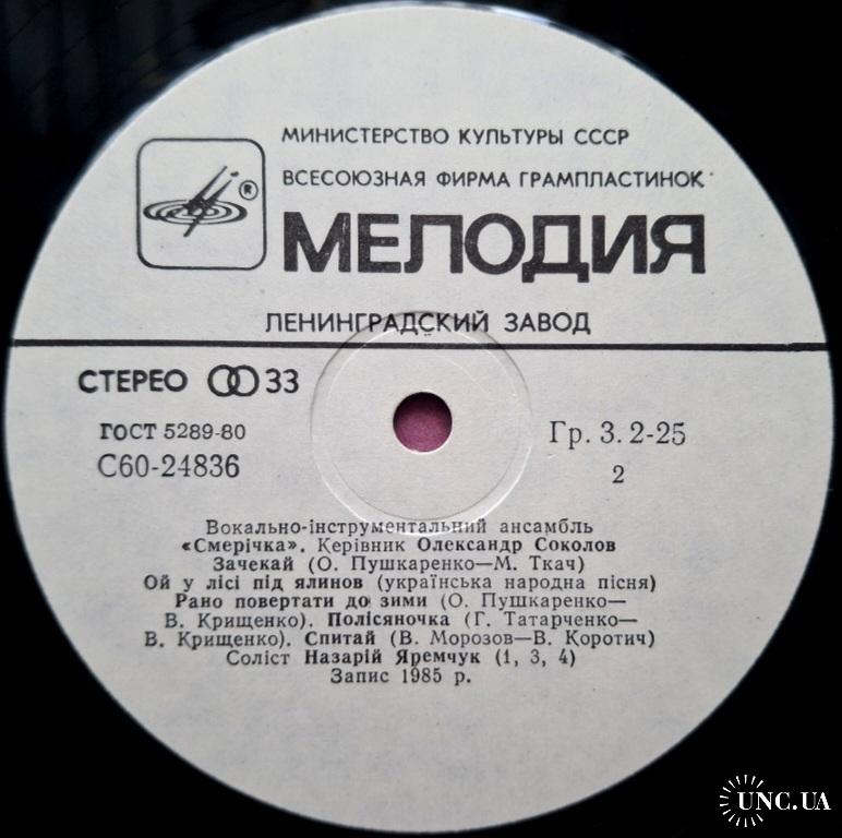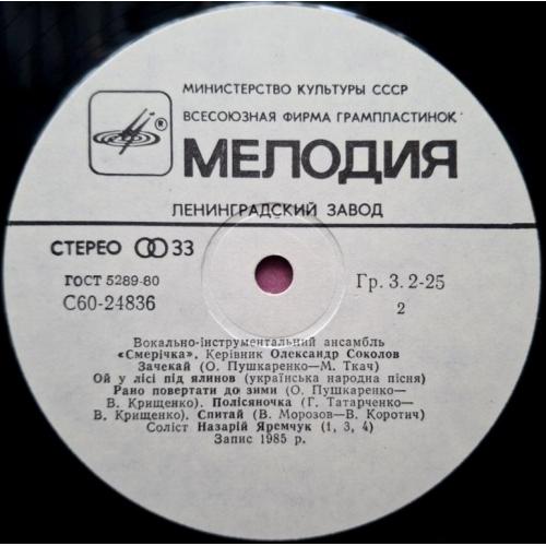 Вінілова платівка. Другий, в дискографії, студійний альбом Українського (радянського) вокально інструментального ансамблю з Чернівецької області, Смерічка, до складу якого, на той час, входили, керівник Левко Дутківський, вокалісти, Назарій Яремчук, Марія Ісак, музиканти, Олексій Гончарук, Олександр Шкляр, Юрій Шорін, Віктор Музичко, Валерій Бурмич, Леонід Сіренко, вокальна група бек вокалу, Раїса Хотимська, Марія Наголюк, Стелла Фрунзе та Ніна Цопа (Порізала м Пальчик) 1985. Випуск фірми (Мелодія) СРСР, Ленінградський завод грамплатівок 1987-ий рік. Стан платівки на вид EX- (поверхневі потертості). Звучить дуже гарно, без піску, шуму і перешкод. Стан конверту ЕХ+. Відправка по Україні службами доставки: Нова Пошта, Укр Пошта, Делівері. Також відправляємо посилки за кордон по цілому світу.