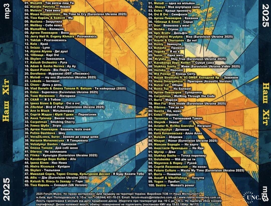 Музичний Диск. Формат МР3. Збірка 100 Кращих Українських Хітів (Наш Хіт) 2025. Випуск фірми (MuzDecor) Ukraine, 2025-ий рік. Видання нове, запаковане. Категорія S/S. Відправка по Україні службами доставки: Нова Пошта, Укр Пошта, Делівері. Також відправляємо посилки за кордон по цілому світу.
