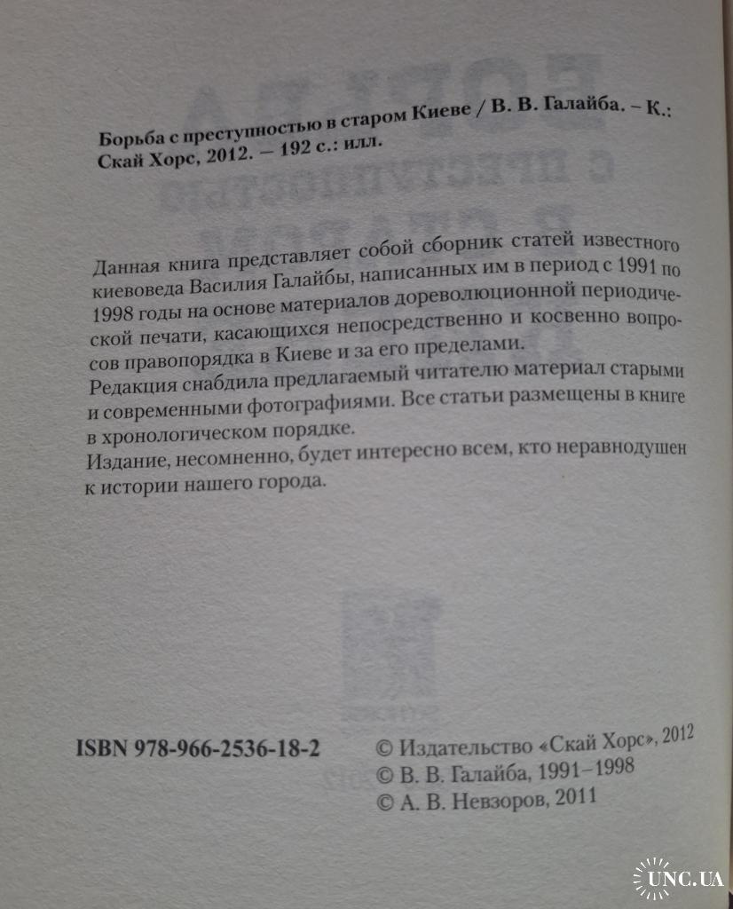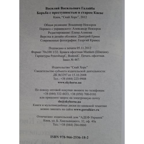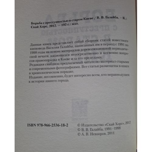 "Борьба с преступностью в старом Киеве" — это сборник статей киевоведа Василия Галайбы, изданный в 2012 году, который основан на материалах дореволюционной прессы и посвящен правопорядку в Киеве XIX – начала XX веков. Книга включает статьи, написанные Галайбой между 1991 и 1998 годами, а также снабжена старыми и современными фотографиями.