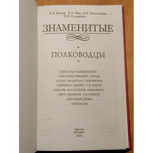 Вагман, Мац, Зиолковская, Скляренко. Знаменитые полководцы. Серия Знаменитые. Издательство: Фолио. 2014 год. Книга новая