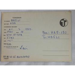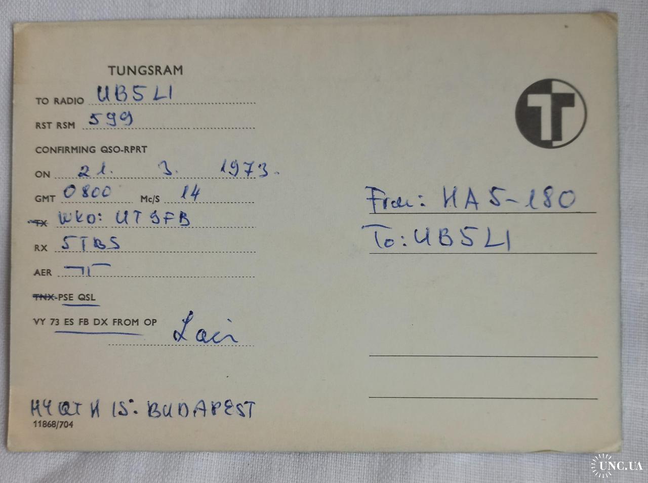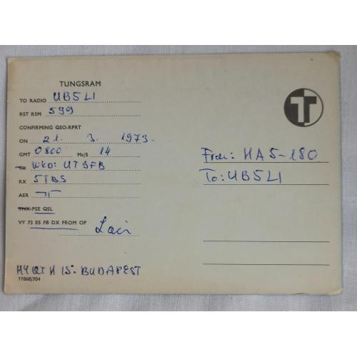 Использован бланк рекламной открытки компании TUNGSRAM,действовавшей с 1896 по 1990 год, как производитель ламп накаливания, радиоламп и полупроводниковых приборов. На лицевой стороне написан от руки позывной-сигнал венгерского радионаблюдателя (отличается от радиооператора тем, что он только наблюдает за радиообменом в эфире двух операторов и непосредственно в этом обмене не участвует, как правило это начинающие радисты-любители, т.н. SWL- short wave listener). На обратной стороне данные радиообмена в эфире и справа вверху логотип компании TUNGSRAM. У карточки слегка примяты уголки, но в целом состояние хорошее.