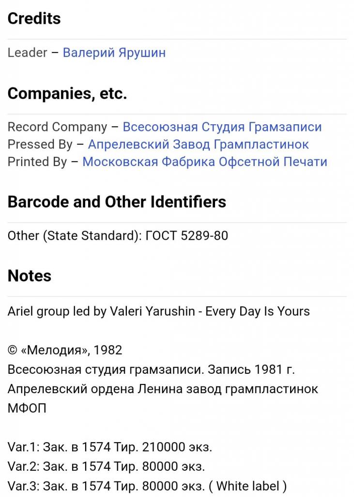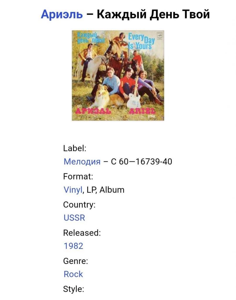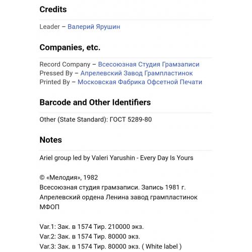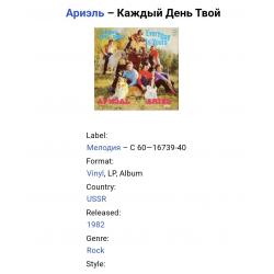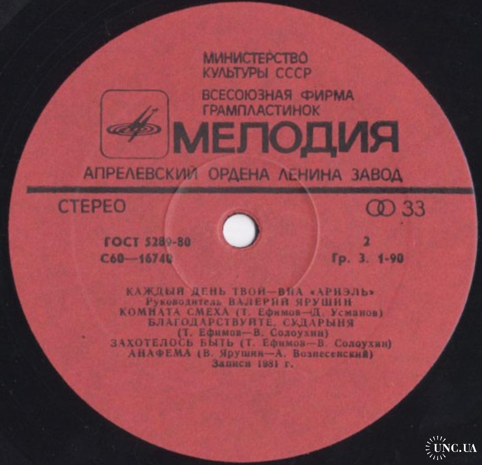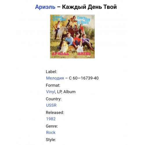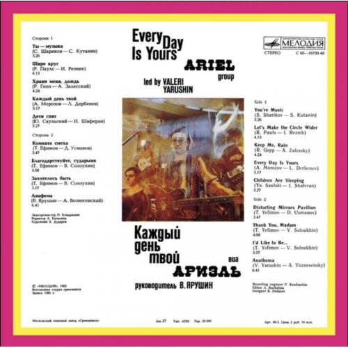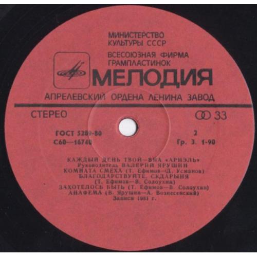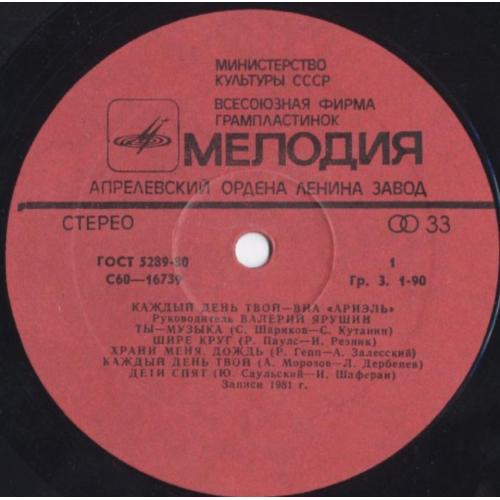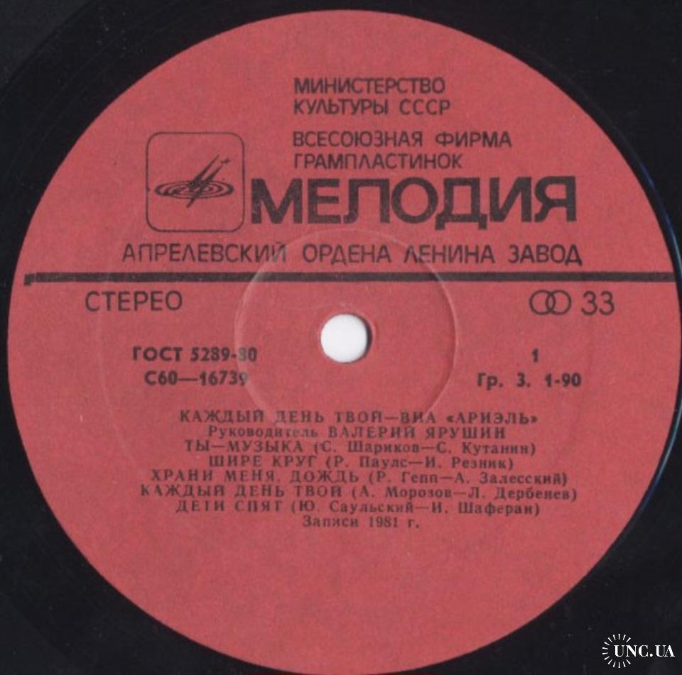 Вінілова платівка. Десятий, в дискографії, студійний альбом, російського (радянського) вокально інструментального ансамблю стилю , поп, рок, фанк, соул Аріель, до складу якого на той час входили учасники Олександр Іванов, Андрій Феофанов, Валерій Ярушин, Сергій Акімов, Олександр Трапезніков, Віктор Літвінов, Анатолій Літвінов, Борис Каплун, Ростислав Гепп, Олександр Тібеліус та Олег Гордєєв (Каждый День Твой) 1981. Випуск фірми (Мелодія) СРСР, Апрелєвський завод грамплатівок, 1982-ий рік. Оригінальне, першопресове видання. Платівка нова, неіграна, під голкою не була. Категорія М (Mint). Стан конверту NM-. Відправка по Україні службами доставки: Нова Пошта, Укр Пошта, Делівері. Також відправляємо посилки за кордон по цілому світу.