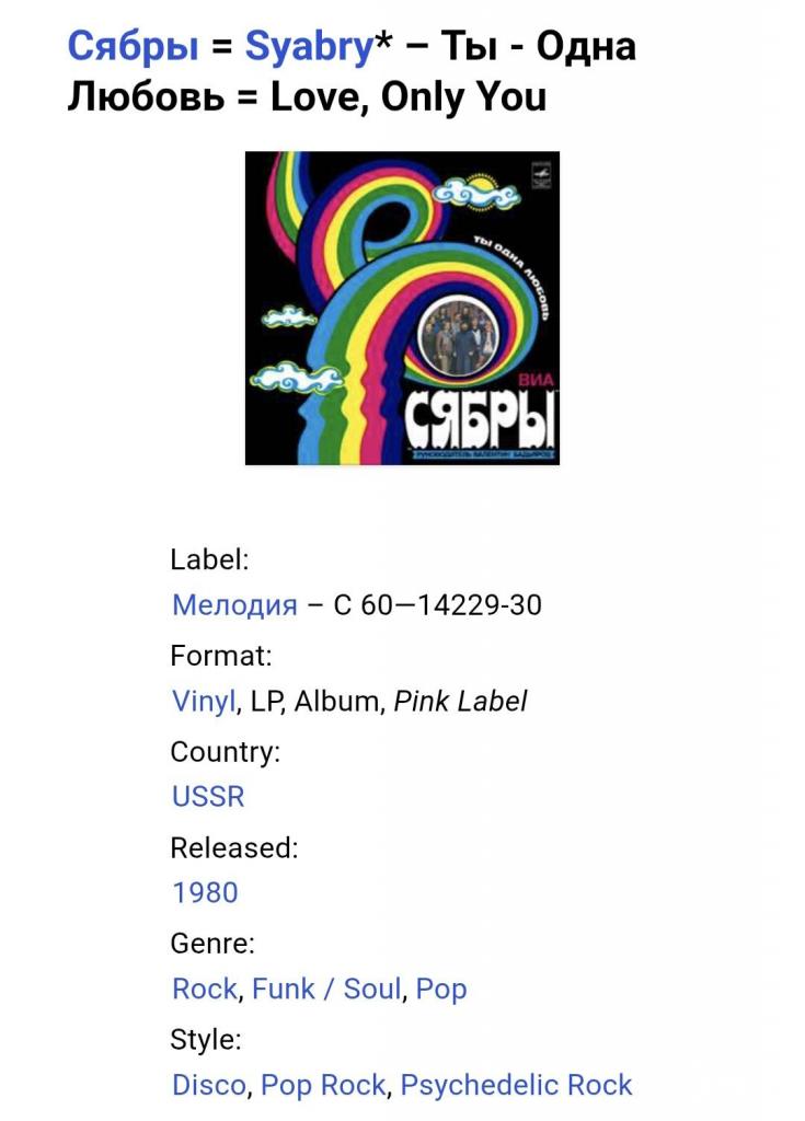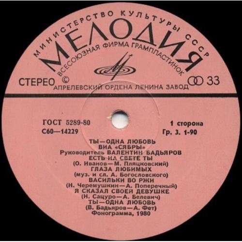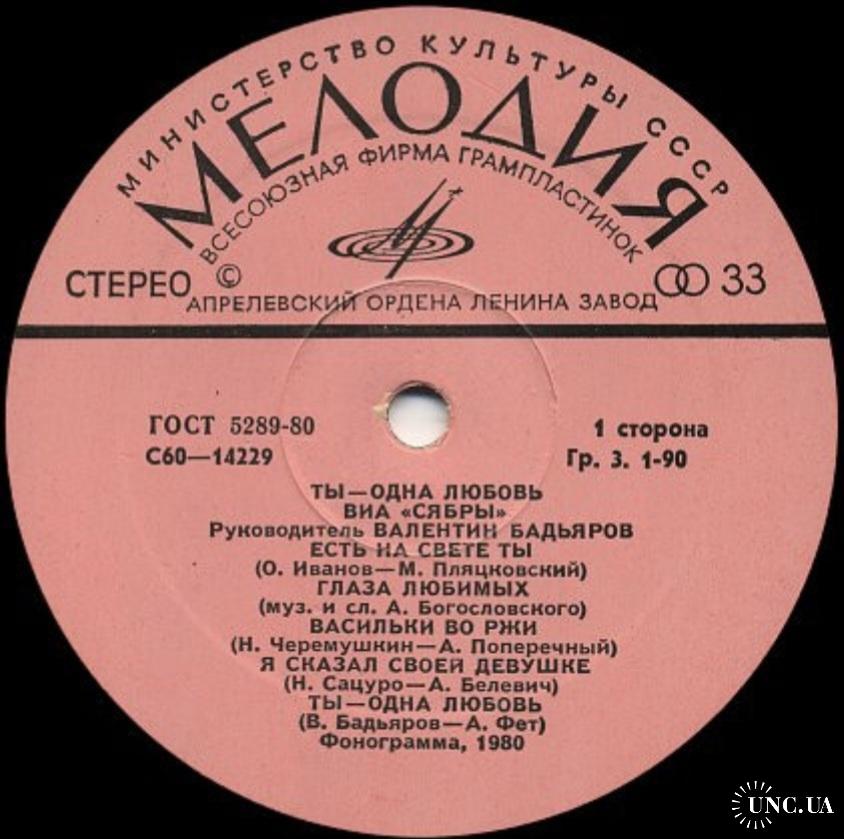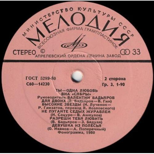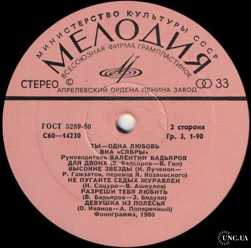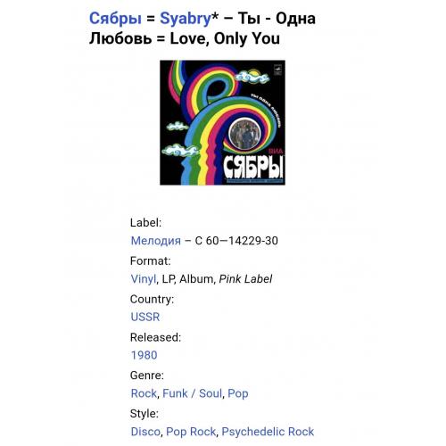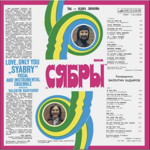 Вінілова платівка. Другий, в дискографії, студійний альбом, білоруського (радянського) вокально інструментального ансамблю стилю поп-рок, фольк, кантрі, Сябри, до складу якого на той час входили учасники Анатолій Ярмоленко, Микола Сацура, Віталій Червонний, Геннадій Балабанов, Олександр Коляда, Олександр Авдевич, Віктор Сенигрибов, Анатолій Гардейонок, Олександр Газизов, Олександр Тихонов, Юрій Хіловець, Федір Жиляк, Андрій Бондаренко, Олександр Харламов та Євген Черкасов (Ты Одна Любовь) 1980. Випуск фірми (Мелодія) СРСР, Апрелєвський завод грамплатівок, 1980-ий рік. Оригінальне, першопресове видання. Платівка нова, неіграна, під голкою не була. Категорія М (Mint). Стан конверту NM-. Відправка по Україні службами доставки: Нова Пошта, Укр Пошта, Делівері. Також відправляємо посилки за кордон по цілому світу.