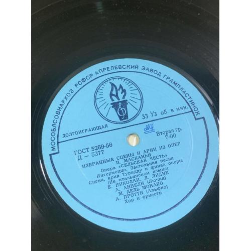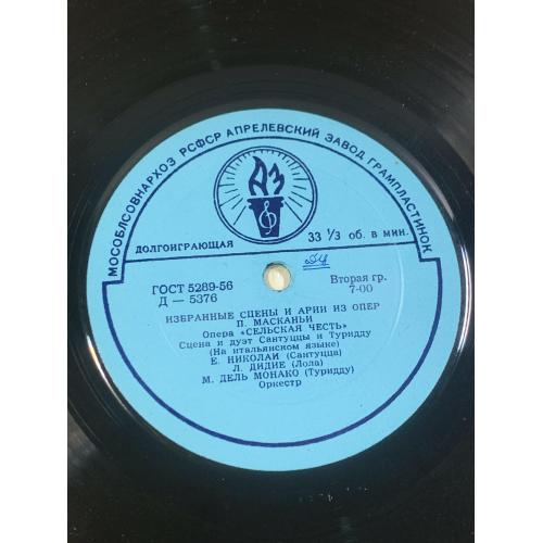 Винтажная долгоиграющая грампластинка с фрагментами знаменитой оперы Пьетро Масканьи «Сельская честь» (Cavalleria Rusticana), выпущенная заводом грампластинок в СССР. Издание относится к классическим записям оперного репертуара и представляет интерес как для ценителей академической музыки, так и для коллекционеров винила.