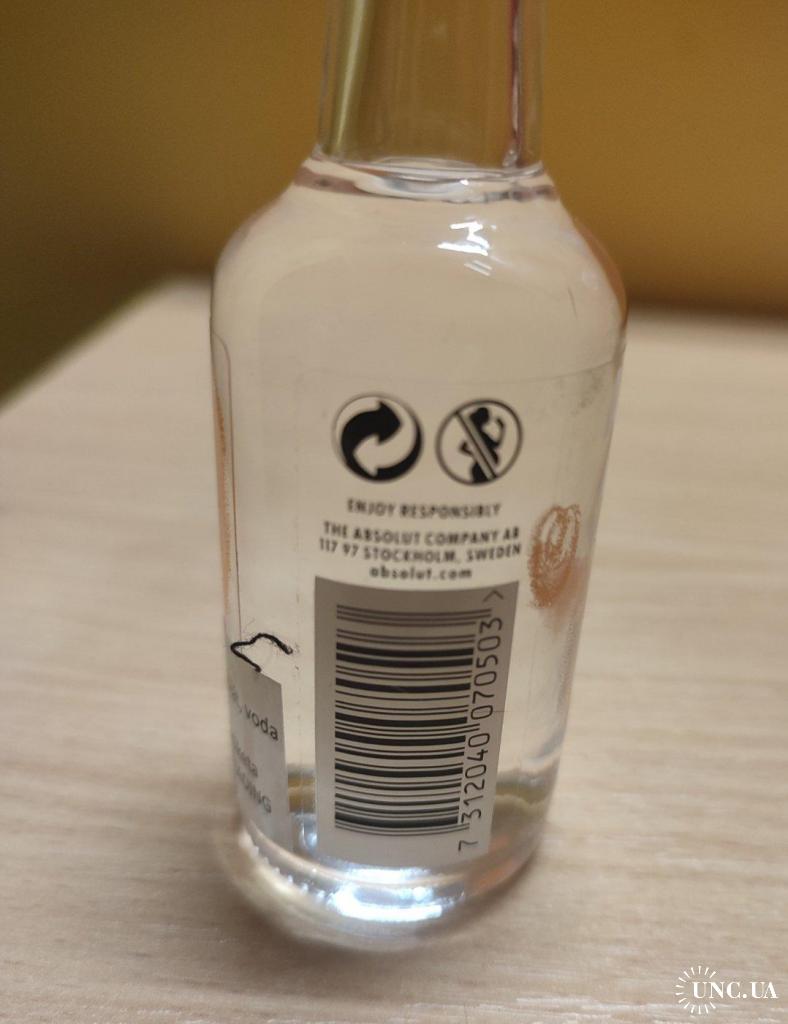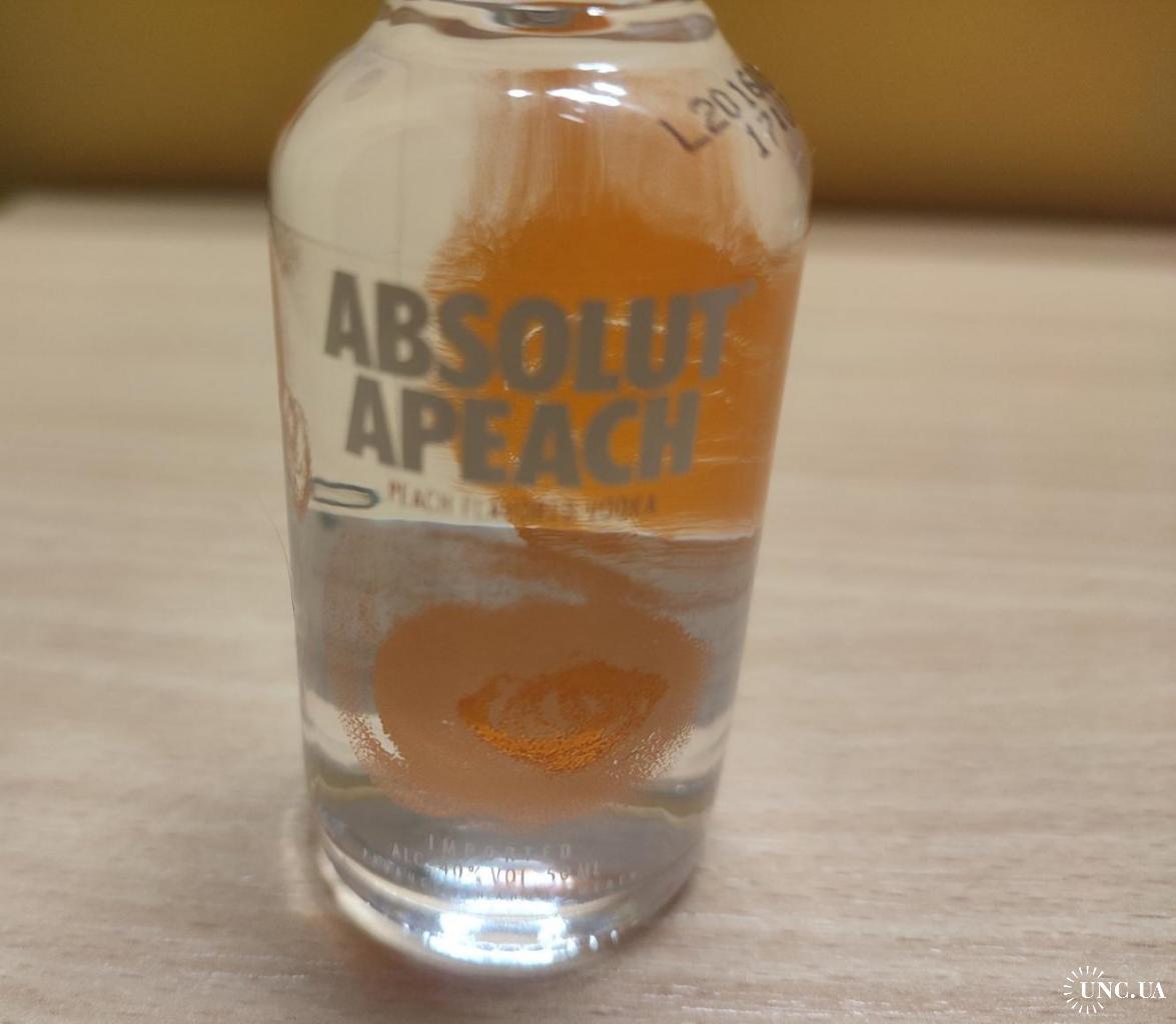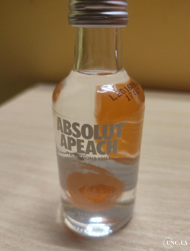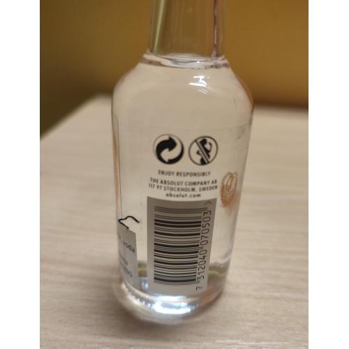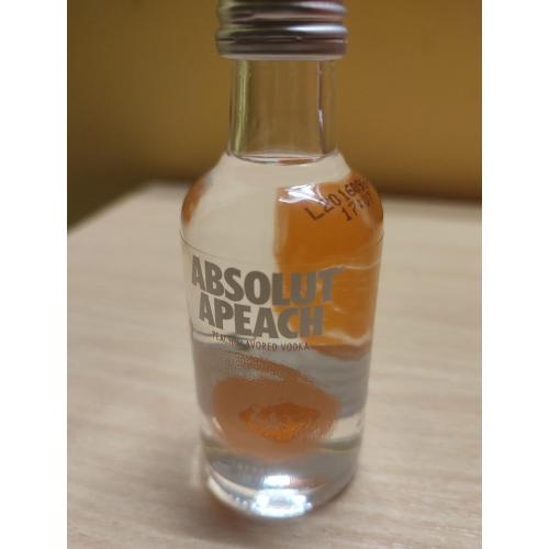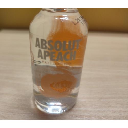 На изображении представлена миниатюрная бутылка водки Absolut Apeach.