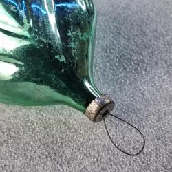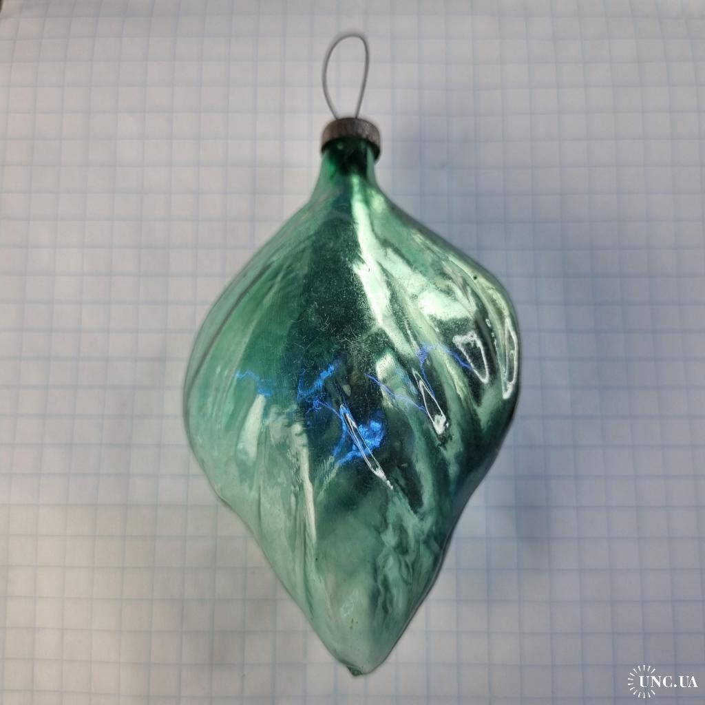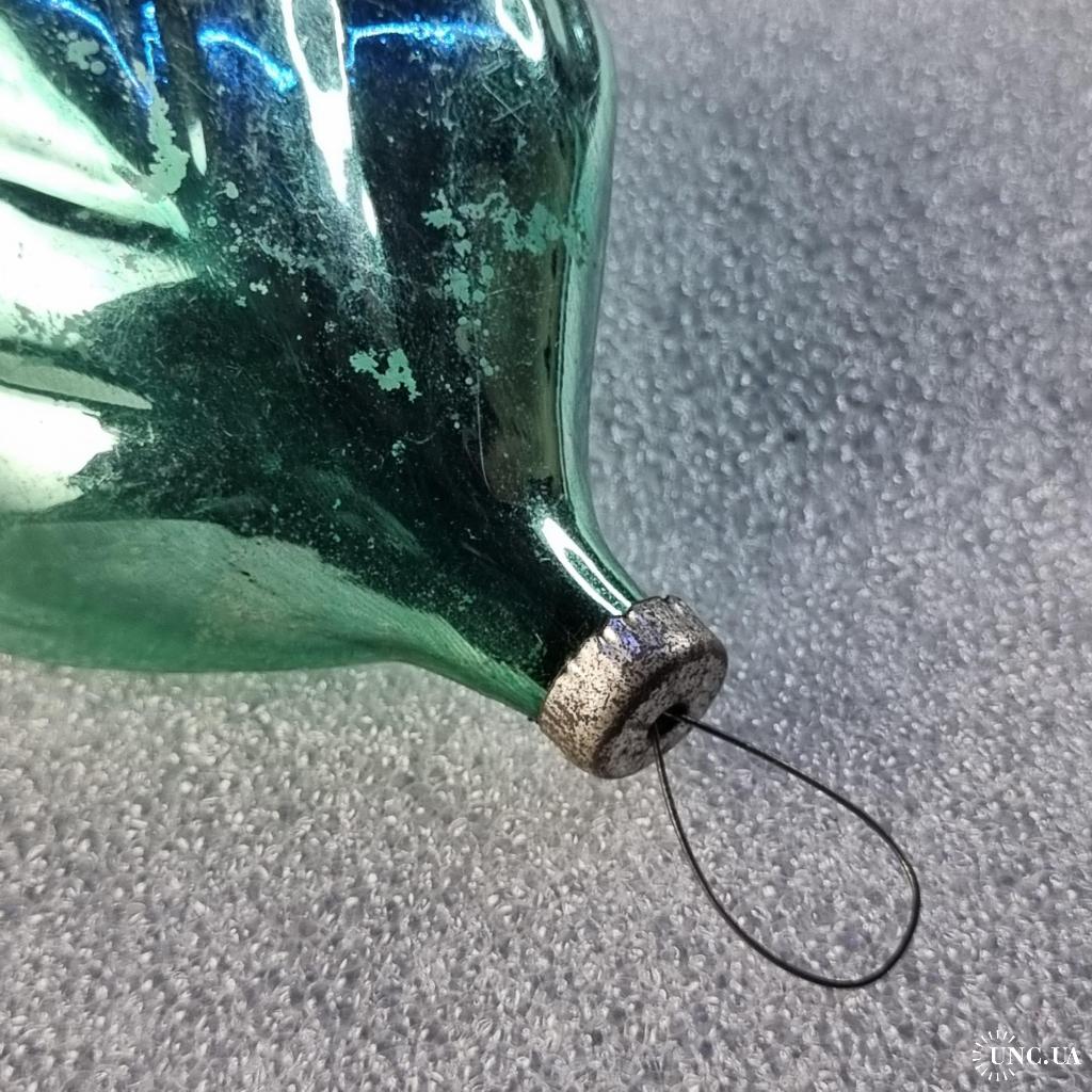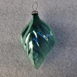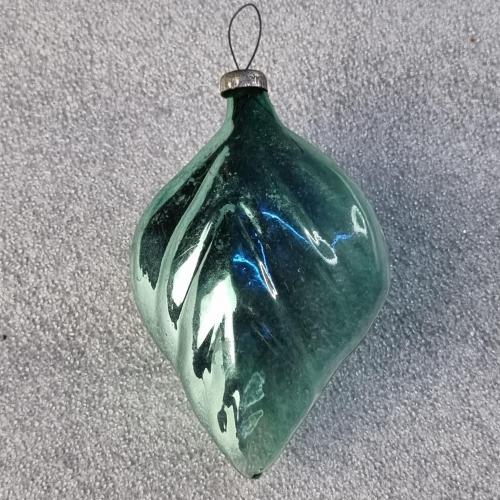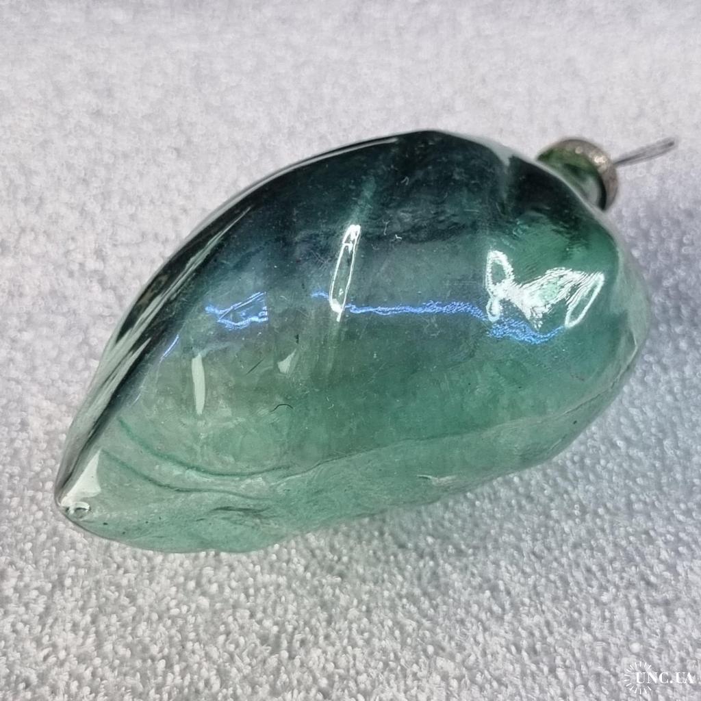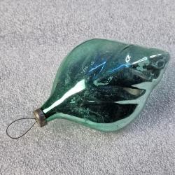 Вінтажна скляна ялинкова прикраса у формі листа з рельєфними прожилками.