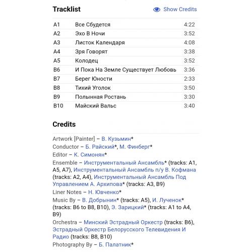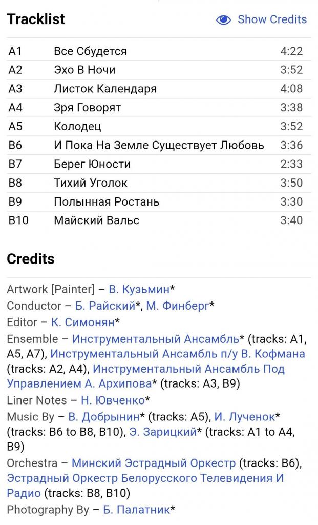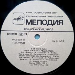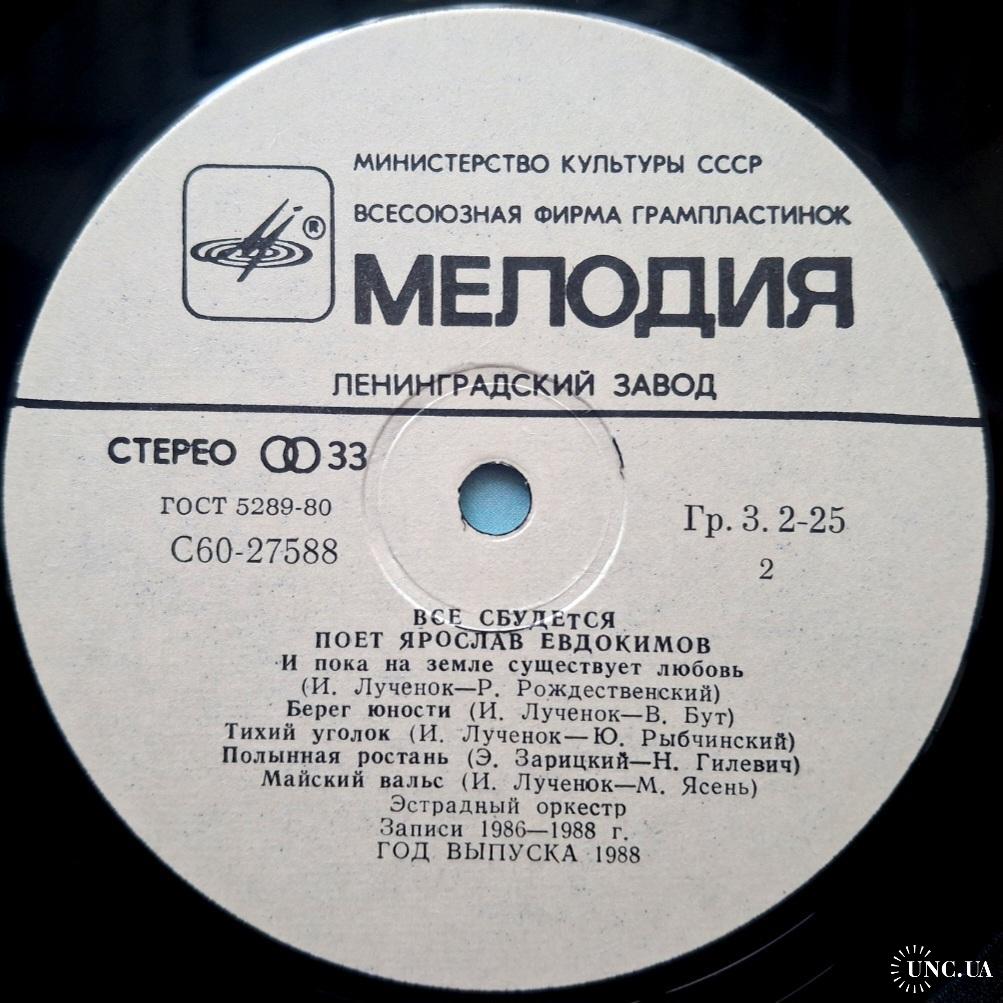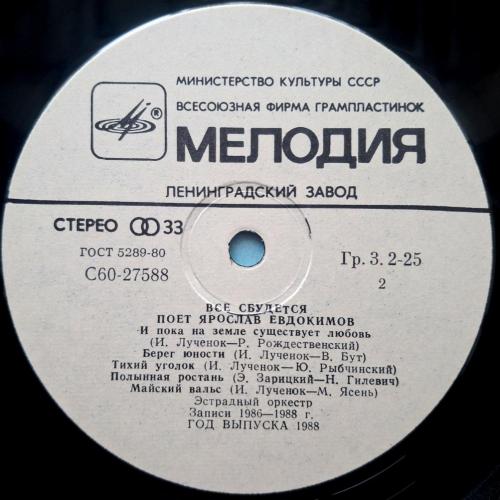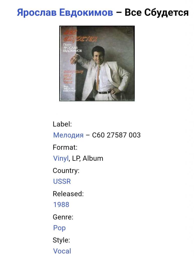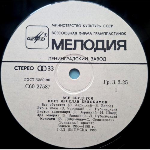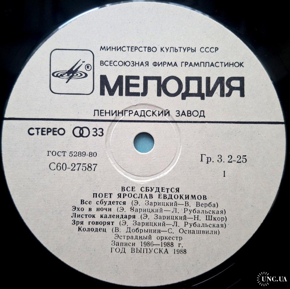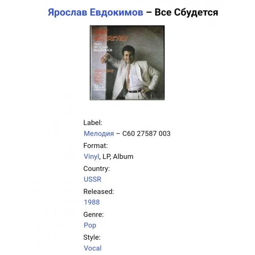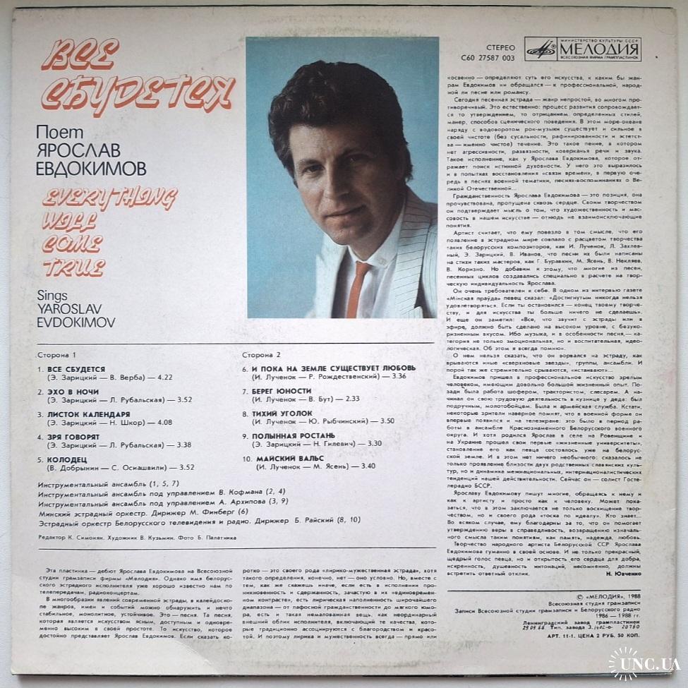 1981-2000Вінілова платівка. Перший, дебютний, в дискографії, студійний альбом, білоруського (радянського) естрадного виконавця, покійного вже, Ярослава Євокимова (Все Сбудется) 1988. Випуск фірми (Мелодія) СРСР, Ленінградським заводом грамплатівок, 1988-ий рік. Оригінальне першопресове видання. Стан платівки NM-. Стан конверту NM-. Відправка по Україні службами доставки: Нова Пошта, Укр Пошта, Делівері. Також відправляємо посилки за кордон по цілому світу.
