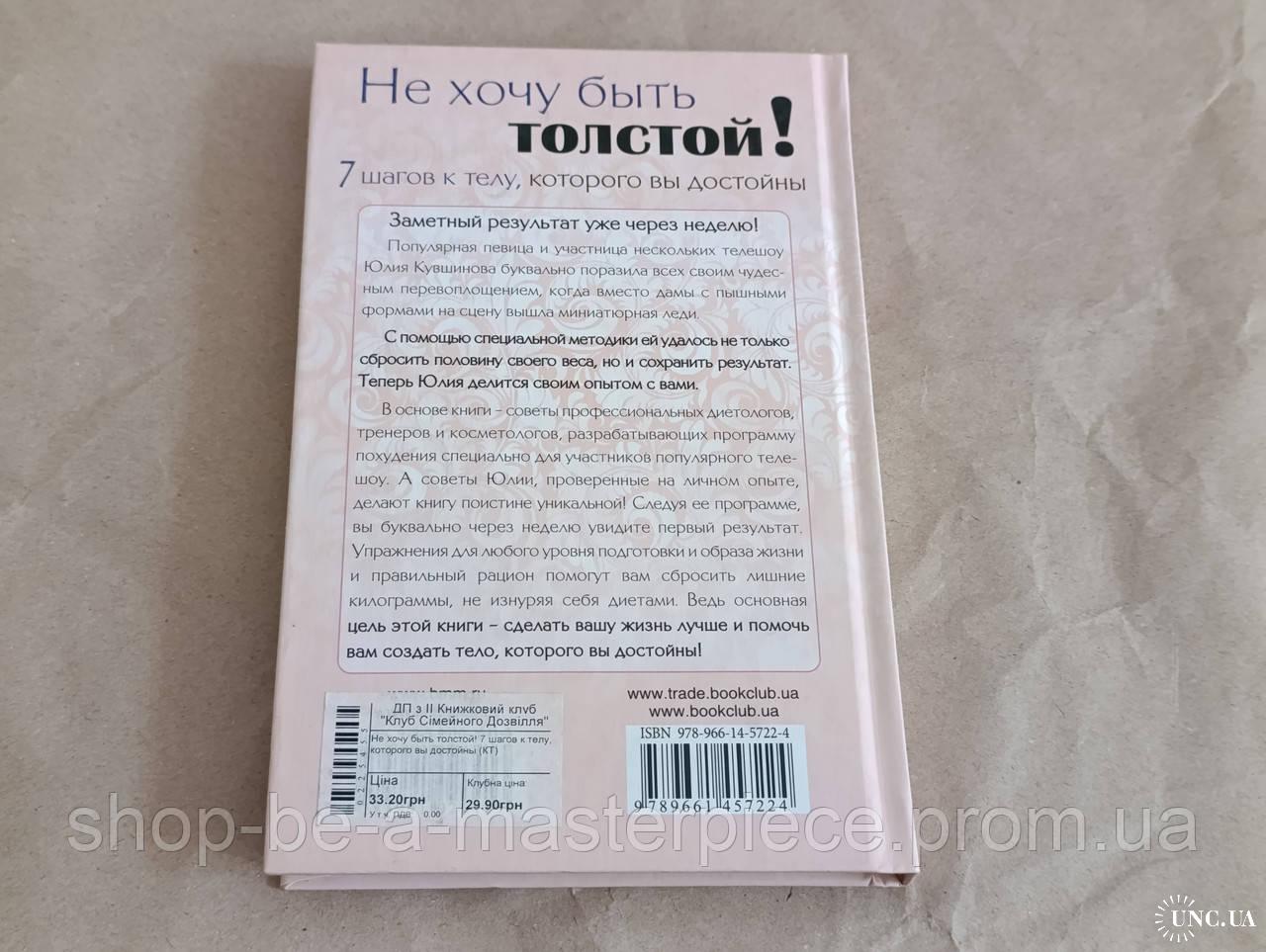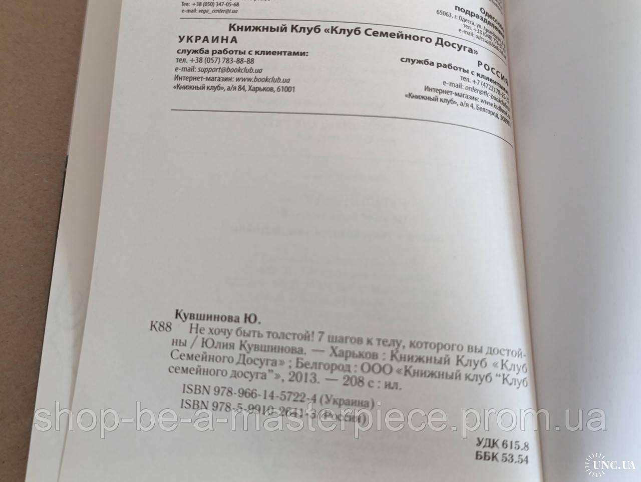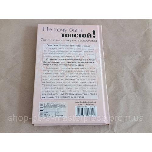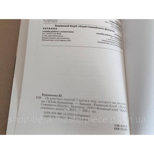 Юлия Кувшинова Не хочу быть Толстой! 7 шагов к телу, которого Вы достойны от призера известного шоу 2015 г. ,208 стр Заметный результат уже через неделю! Популярная певица и участнице нескольких телешоу Юлия Кувшинова буквально поразила всех своим чуд ным перевоплощением, когда вместо дамы с пышными формами на сцену вышла миниатюрная леди. С помощью специальной методики ей удалось не только сбросить половину своего веса, но и сохранить результат. Теперь Юлия делится своим опытом с вами. В основе книги советы профессиональных диетологов, тренеров и косметологов, разрабатывающих программу похудения специально для участников популярного теле шоу. А советы Юлии, проверенные на личном опыте, делают книгу поистине уникальной! Следуя ее программе, вы буквально через неделю увидите первый результат. Упражнения для любого уровня подготовки и образа жизни и правильный рацион помогут вам сбросить лишние килограммы, не изнуряя себя диетами. Ведь основная цель этой книги сделать вашу жизнь лучше и помочь вам создать тело, которого вы достойны!Відповіді продавця на ваші питання