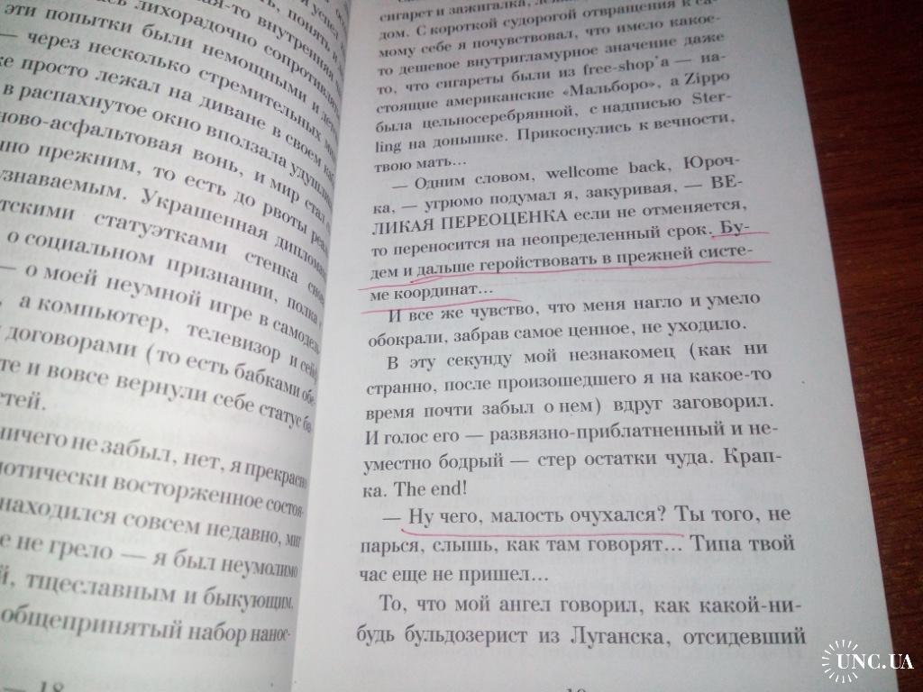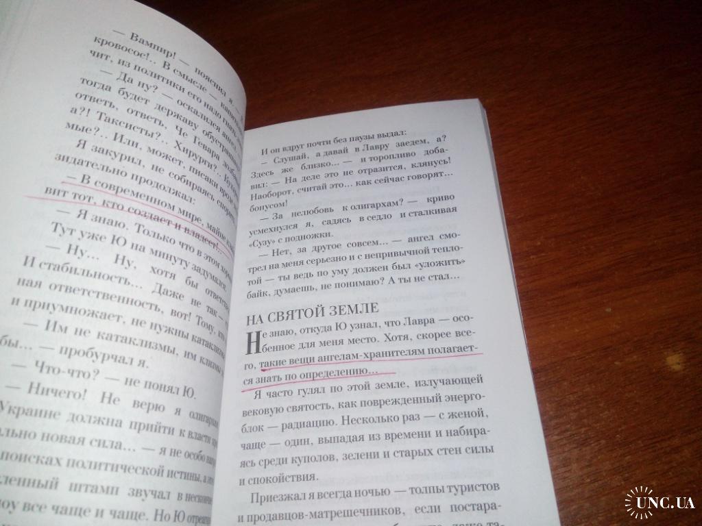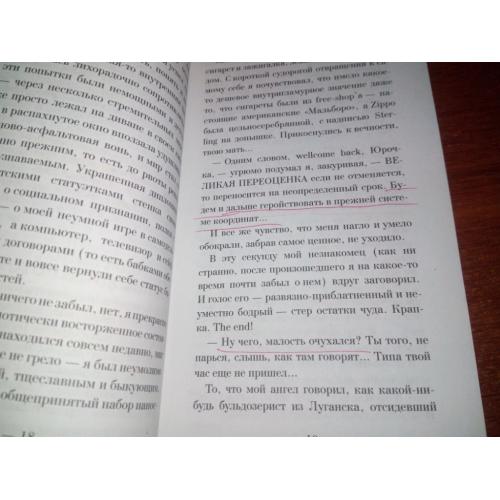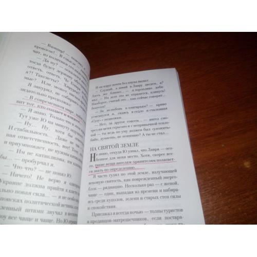 Книга слегка выгнута, текст на нескольких страницах подчёркнут шариковой ручкой.