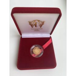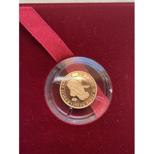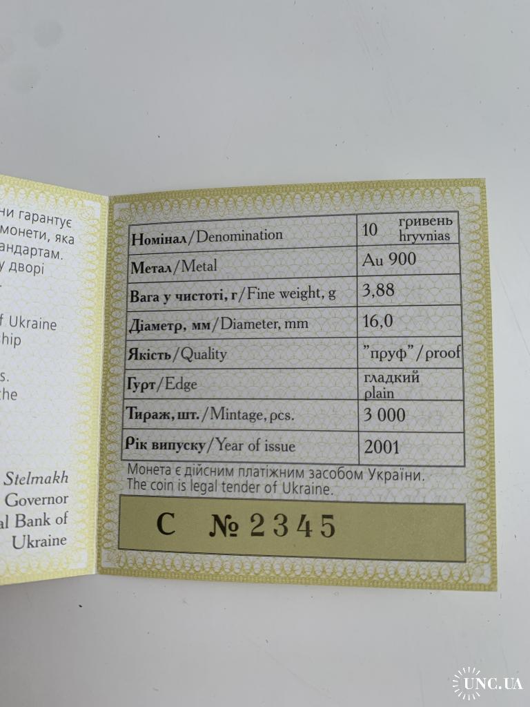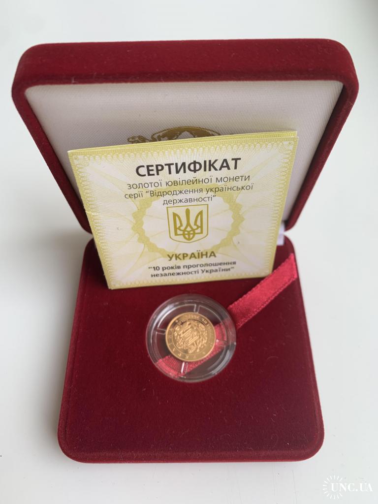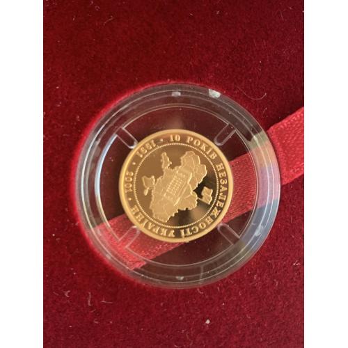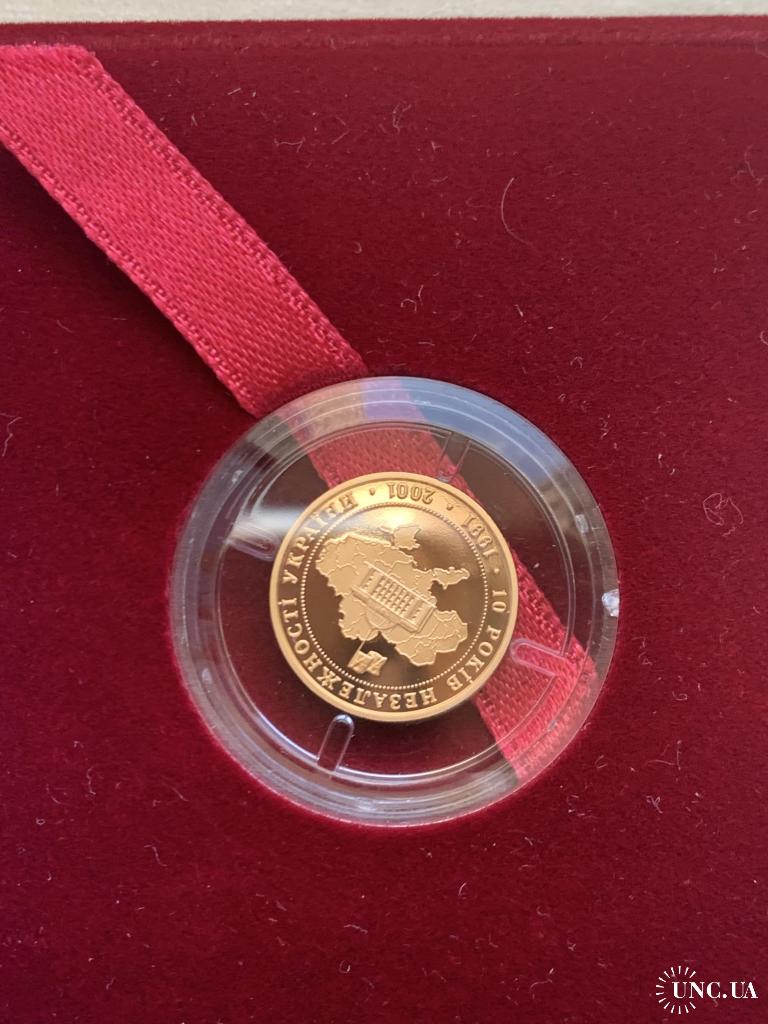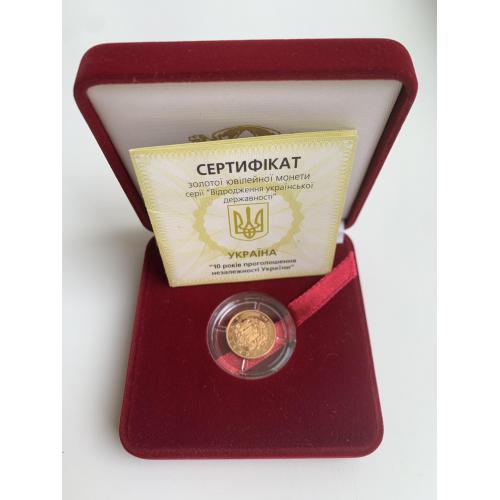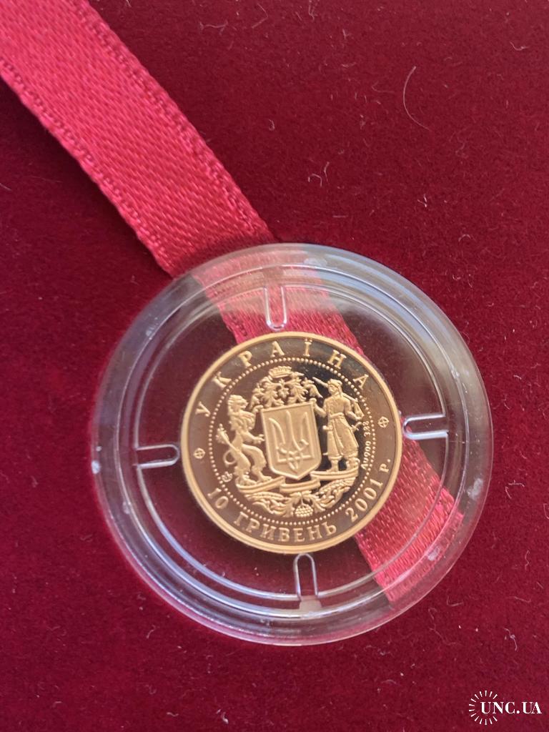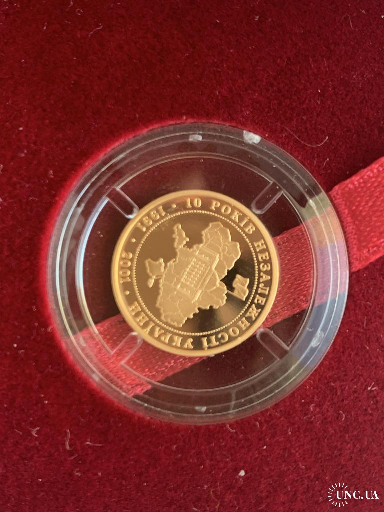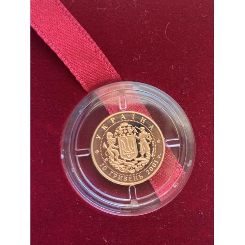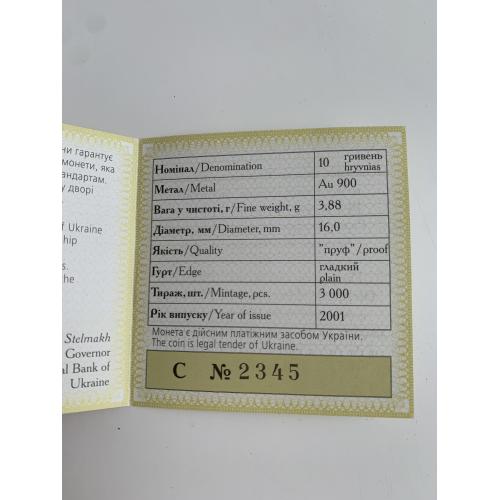 ОригіналПродам золоту монету НБУ номіналом 10 гривень 2001 р. випуску. Серія: Відродження української державності, присвячена 10-й річниці незалежності України. Монета в оригінальній капсулі. Вага дорогоцінного металу в чистоті: 3.88 г., золото 900 проби, діаметр, 16 мм.