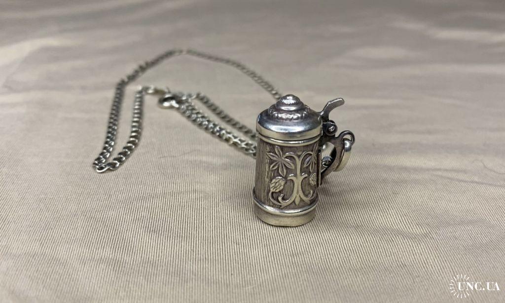 6lt41 Кулон пивная кружка с цепочкой. Крышка открывается. Серебро 925. Вес 7 грамм. Высота кружки 2,