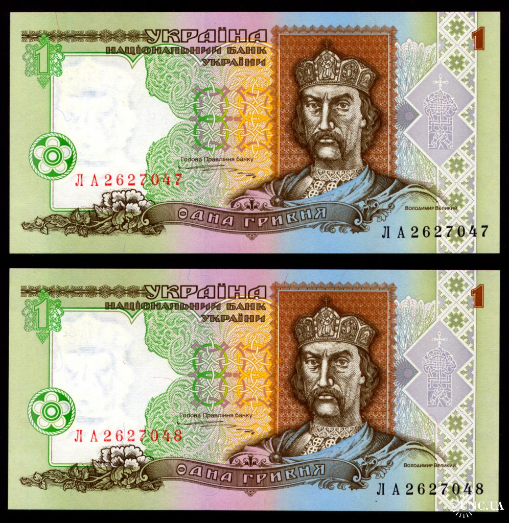 УКРАИНА 108b UKRAINE ЮЩЕНКО; СТАРТОВА СЕРИЯ ЛА 2627047-48 ПАРА З НОМЕРАМИ ПОСПІЛЬ; 1 ГРИВНЯ 1995 Unc