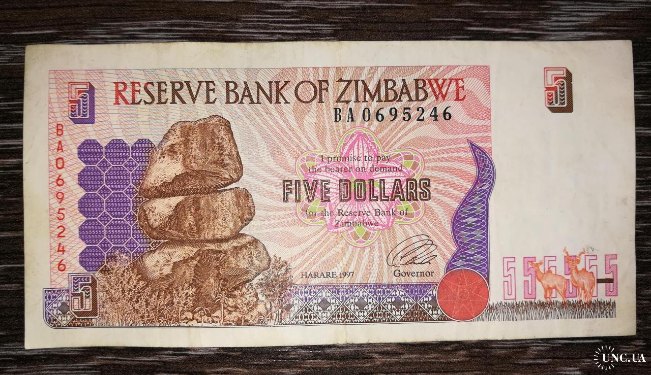 ZIMBABWE Зімбабве 5 доларів 1997 тип 1, рідкість (ВА серія). Металографія, реверс світло-коричневий.