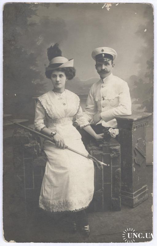 Киев Фото кабинетное Чиновник Дама Часы Зонтик Кулон цепочка Шляпка заколка Платье Мода Форма Винтаж