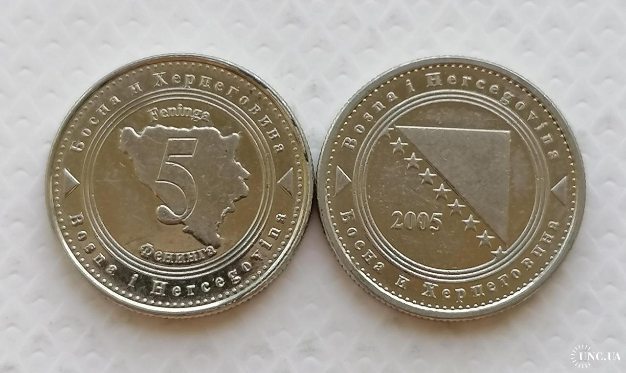 Грошова одиниця Боснії і Герцеговини - конвертована марка. 1 марка дорівнює 100 фенінгам. В обігу знаходяться монети номіналами в 5, 10, 20, 50 фенінгов, 1, 2 і 5 марок. Монети в фенінгах випущені в обіг 9 грудня 1998 за винятком 5 фенінгов, випущених 5 січня 2006.