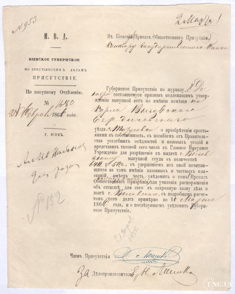 МВД Киевское губернское по крестьянским делам присутствие по выкупному отделению 1866 Карл Выговский
