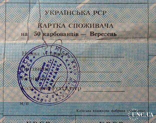 КАРТКА СПОЖИВАЧА R93.9 КИЇВСЬКА КНИЖКОВА ФАБРИКА «ЖОВТЕНЬ», "KIA"; 100 КАРБОВАНЦІВ КВІТЕНЬ 1991 aUnc